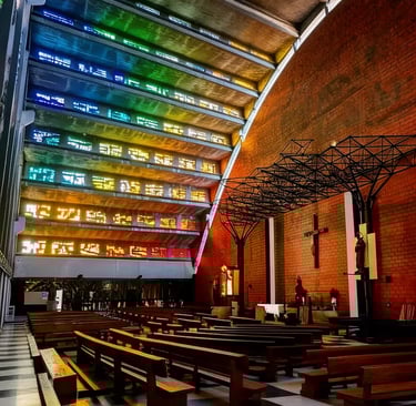 Bands of stained glass run along the curve of the structure, allowing colored light to filter across the interior as the sun moves throughout the day. The effect is calm and contemplative rather than monumental. You’ll also find Martínez’s own wrought-iron sculptures, including a striking Stations of the Cross. Visitors often find themselves sitting quietly for several minutes, watching the shifting colors move across the floor and walls.