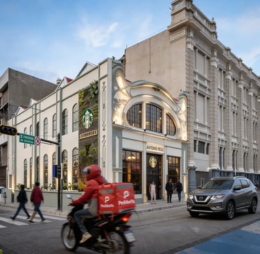 Today the building has entered a new chapter. Rather than demolishing the structure and replacing it with something new, the restoration preserved the historic architecture and adapted the interior for contemporary use. The building now houses Casa Bou Starbucks, a flagship location that incorporates Salvadoran artwork and design elements into the space. The restoration preserved the original metal skylight and ornamental moldings while integrating modern elements like handcrafted wood furniture and stained-glass panels by Margarita Llort that narrate the journey of coffee. The goal is not simply to modernize the district, but to allow historic architecture to remain part of the city’s everyday life.